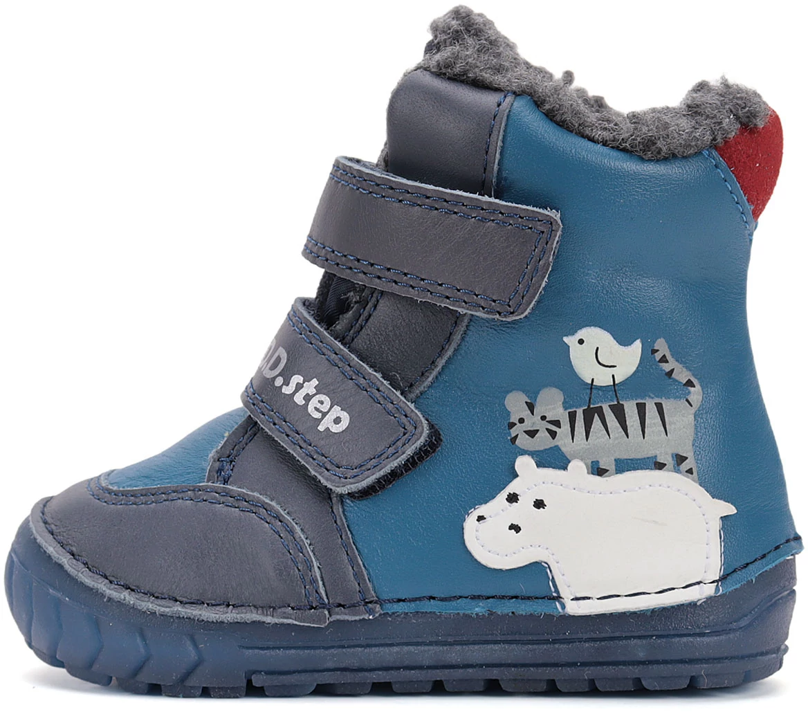 A D.D.Step W029-52287 egy kiváló minőségű, meleg bélelt téli gyerekcipő, amely a hideg hónapokra készült. Természetes bőr felsőrésze vízlepergető bevonatot kapott, így hatékonyan védi a lábat a nedvességtől és a hidegtől. A puha, meleg bélés és a kivehető, szőrös talpbetét gondoskodik a maximális kényelemről és hőszigetelésről.A hajlékony, csúszásmentes talp biztosítja a stabil járást, a megerősített orr- és sarokrész pedig védi a lábat a mindennapi használat során. Két tépőzáras pánttal könnyen és gyorsan fel- és levehető, a magasabb lábfejű gyerekek számára is kényelmes viselet.
