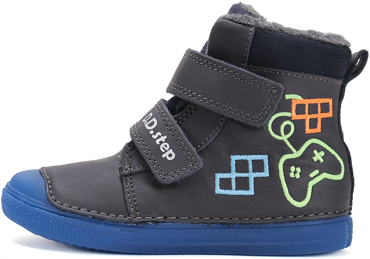 DDStep valódi bőr vízlepergető téli bélelt gyerekcipő kék színben fiúk számára fluoreszkáló díszítéssel