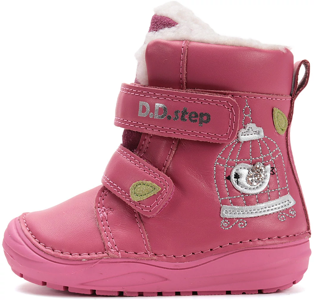A D.D.Step W071-52381 egy kiváló minőségű, meleg bélelt téli gyerekcipő, amely a hideg hónapokra készült. Természetes bőr felsőrésze vízlepergető bevonatot kapott, így hatékonyan védi a lábat a nedvességtől és a hidegtől. A puha, meleg bélés és a kivehető, szőrös talpbetét gondoskodik a maximális kényelemről és hőszigetelésről.A hajlékony, csúszásmentes talp biztosítja a stabil járást, a megerősített orr- és sarokrész pedig védi a lábat a mindennapi használat során. Két tépőzáras pánttal könnyen és gyorsan fel- és levehető, a magasabb lábfejű gyerekek számára is kényelmes viselet.