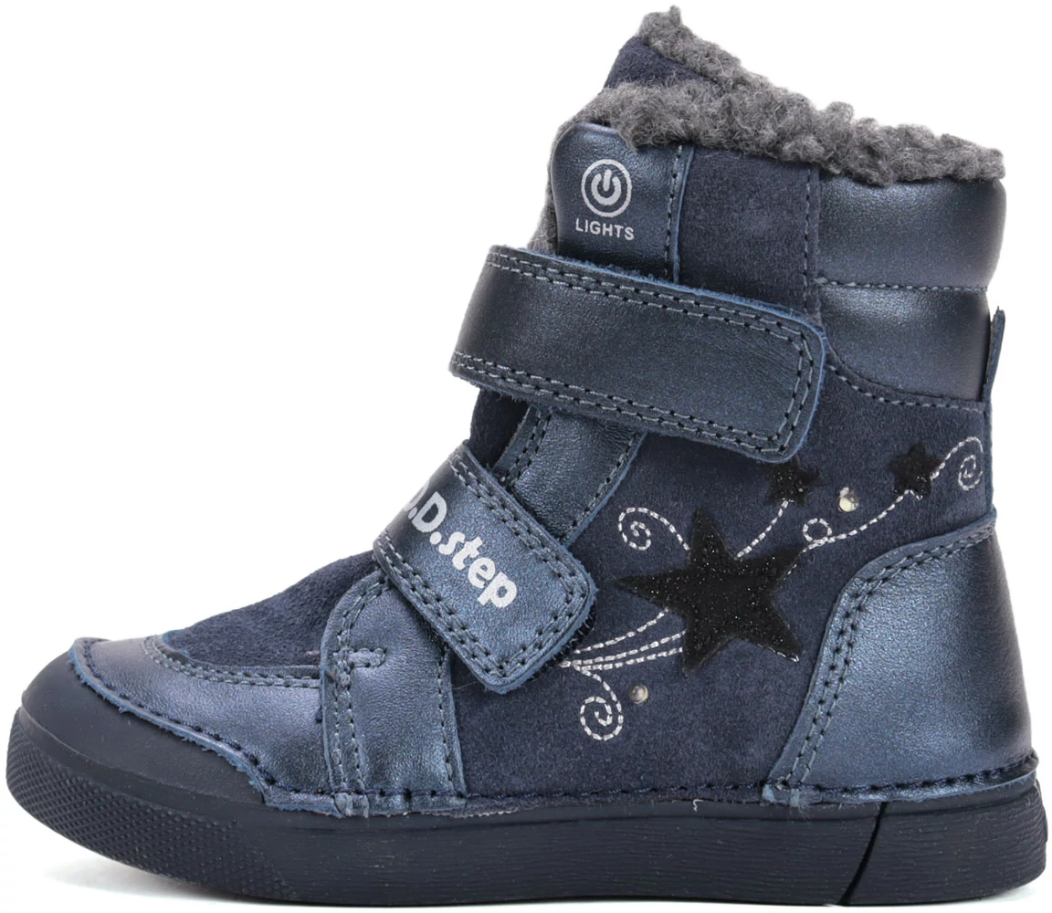 A D.D.Step egy kiváló minőségű, meleg bélelt téli gyerekcipő, amely a hideg hónapokra készült. Természetes bőr felsőrésze vízlepergető bevonatot kapott, így hatékonyan védi a lábat a nedvességtől és a hidegtől. A puha, meleg bélés és a kivehető, szőrös talpbetét gondoskodik a maximális kényelemről és hőszigetelésről.A hajlékony, csúszásmentes talp biztosítja a stabil járást, a megerősített orr- és sarokrész pedig védi a lábat a mindennapi használat során. Két tépőzáras pánttal könnyen és gyorsan fel- és levehető, a magasabb lábfejű gyerekek számára is kényelmes viselet.
