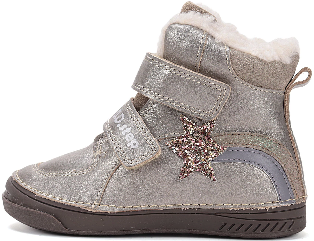 DDStep valódi bőr vízlepergető téli bélelt gyerekcipő pezsgő színben lányok számára fluoreszkáló díszítéssel
