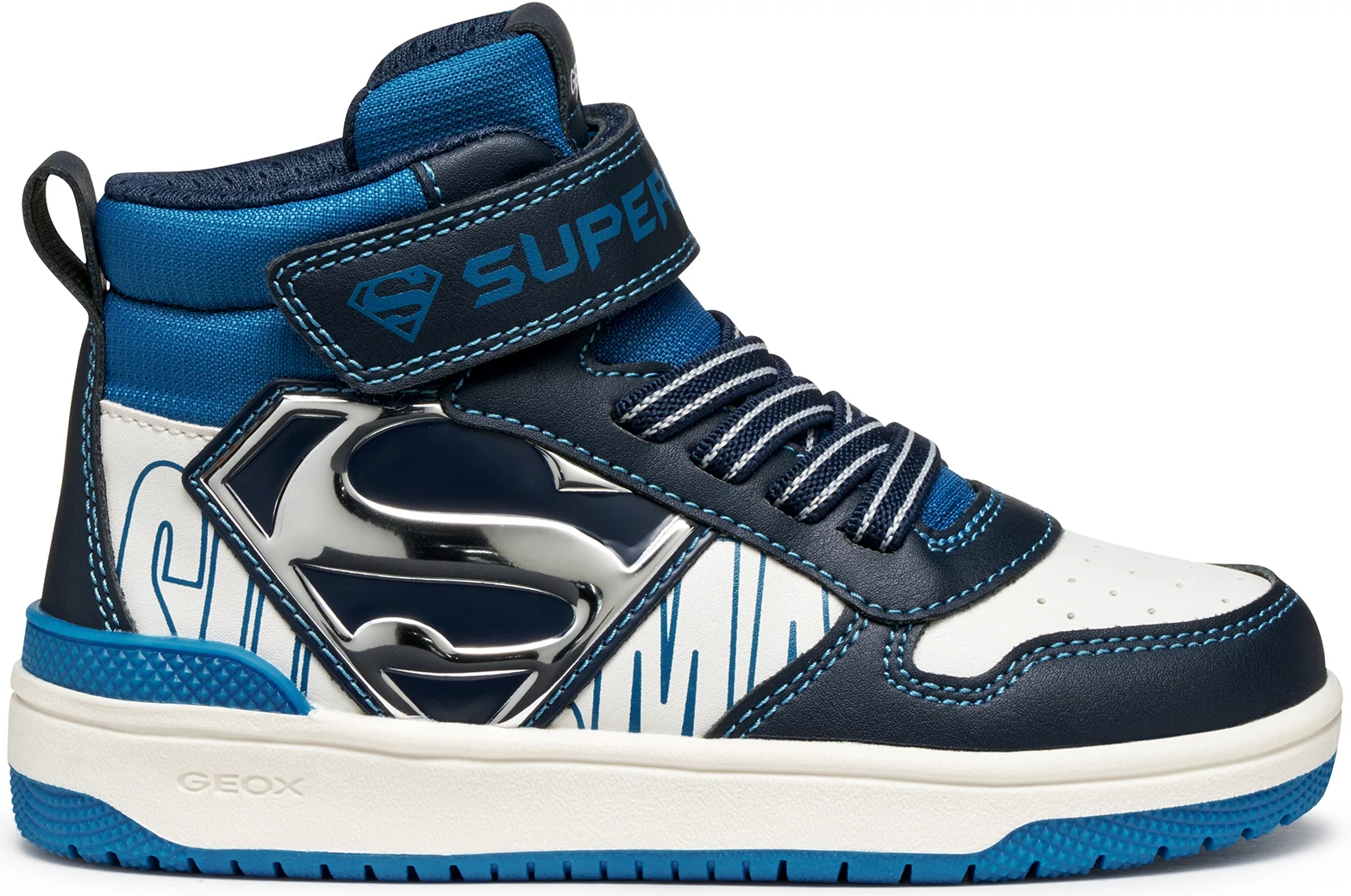 A Geox Washiba fiú magas szárú sneakerje stílusos Superman dizájnnal készült, fekete és fehér színkombinációban. A műbőr és textil felsőrész tartós és könnyen tisztán tartható, míg a gumi talp jó tapadást biztosít. A tépőzáras záródás gyors és egyszerű fel- és levételt tesz lehetővé. Ideális választás a mindennapi iskolai viselethez és szabadidős tevékenységekhez.