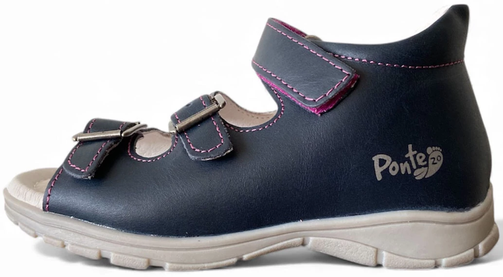 A Ponte20 szandál a kifejezetten gyerekek számára tervezett, egészséges lábfejlődést támogató, minőségi lábbeli. Szupinált talpkialakítása finoman megemeli a sarok belső részét, ezáltal korrigálja a befelé dőlő bokát és segíti a megfelelő lábtengely kialakulását. A felsőrész puha, valódi bőrből készült, amely jól szellőzik, nem töri a gyerek lábát, és hosszú távon is kényelmes marad. A hárompontos rögzítés gyors és egyszerű felvételt tesz lehetővé, ugyanakkor biztos tartást ad a lábfejnek és bokának. A könnyített talp rugalmasan követi a gyerek mozgását, miközben kiváló tapadást nyújt. A belső talpbélés puha, komfortos, akár egész napos viseletre is alkalmassá teszi a szandált.