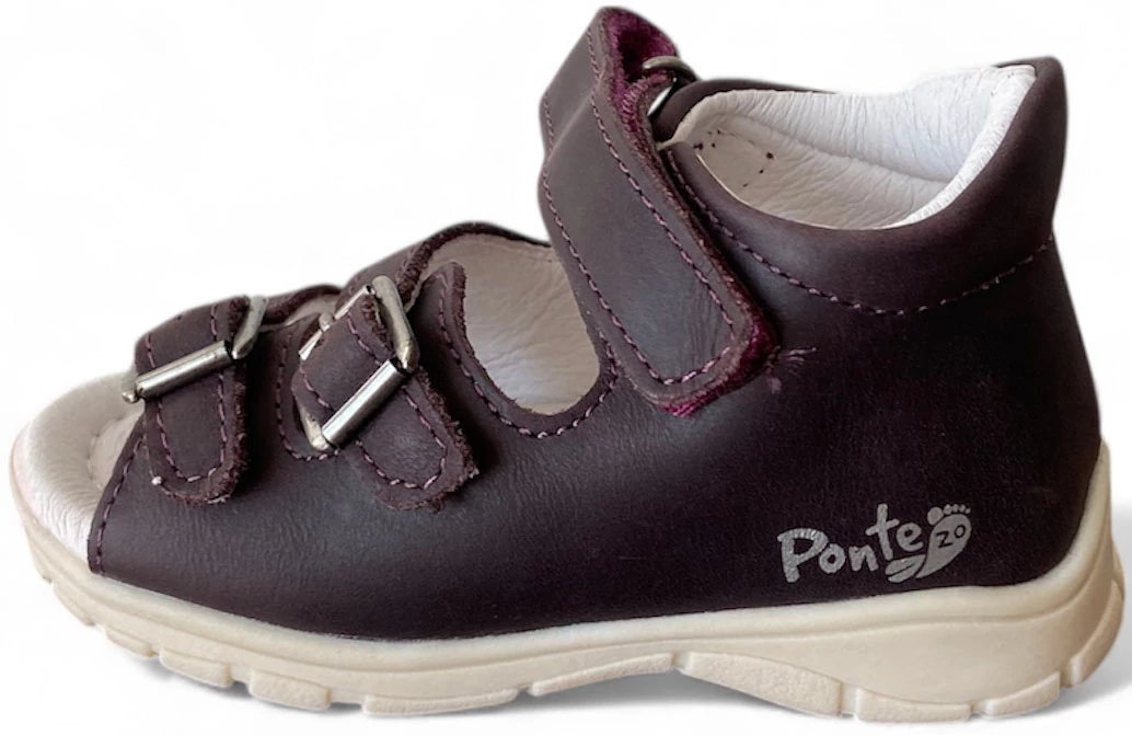 A Ponte20 szandál a kifejezetten gyerekek számára tervezett, egészséges lábfejlődést támogató, minőségi lábbeli. Szupinált talpkialakítása finoman megemeli a sarok belső részét, ezáltal korrigálja a befelé dőlő bokát és segíti a megfelelő lábtengely kialakulását. A felsőrész puha, valódi bőrből készült, amely jól szellőzik, nem töri a gyerek lábát, és hosszú távon is kényelmes marad. A hárompontos rögzítés gyors és egyszerű felvételt tesz lehetővé, ugyanakkor biztos tartást ad a lábfejnek és bokának. A könnyített talp rugalmasan követi a gyerek mozgását, miközben kiváló tapadást nyújt. A belső talpbélés puha, komfortos, akár egész napos viseletre is alkalmassá teszi a szandált.