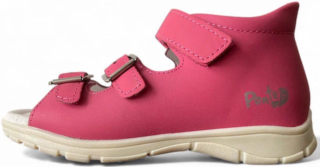 A Ponte20 szandál a kifejezetten gyerekek számára tervezett, egészséges lábfejlődést támogató, minőségi lábbeli. Szupinált talpkialakítása finoman megemeli a sarok belső részét, ezáltal korrigálja a befelé dőlő bokát és segíti a megfelelő lábtengely kialakulását. A felsőrész puha, valódi bőrből készült, amely jól szellőzik, nem töri a gyerek lábát, és hosszú távon is kényelmes marad. A hárompontos rögzítés gyors és egyszerű felvételt tesz lehetővé, ugyanakkor biztos tartást ad a lábfejnek és bokának. A könnyített talp rugalmasan követi a gyerek mozgását, miközben kiváló tapadást nyújt. A belső talpbélés puha, komfortos, akár egész napos viseletre is alkalmassá teszi a szandált.
