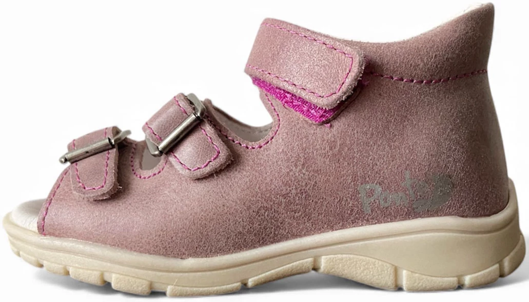 A Ponte20 szandál a kifejezetten gyerekek számára tervezett, egészséges lábfejlődést támogató, minőségi lábbeli. Szupinált talpkialakítása finoman megemeli a sarok belső részét, ezáltal korrigálja a befelé dőlő bokát és segíti a megfelelő lábtengely kialakulását. A felsőrész puha, valódi bőrből készült, amely jól szellőzik, nem töri a gyerek lábát, és hosszú távon is kényelmes marad. A hárompontos rögzítés gyors és egyszerű felvételt tesz lehetővé, ugyanakkor biztos tartást ad a lábfejnek és bokának. A könnyített talp rugalmasan követi a gyerek mozgását, miközben kiváló tapadást nyújt. A belső talpbélés puha, komfortos, akár egész napos viseletre is alkalmassá teszi a szandált.