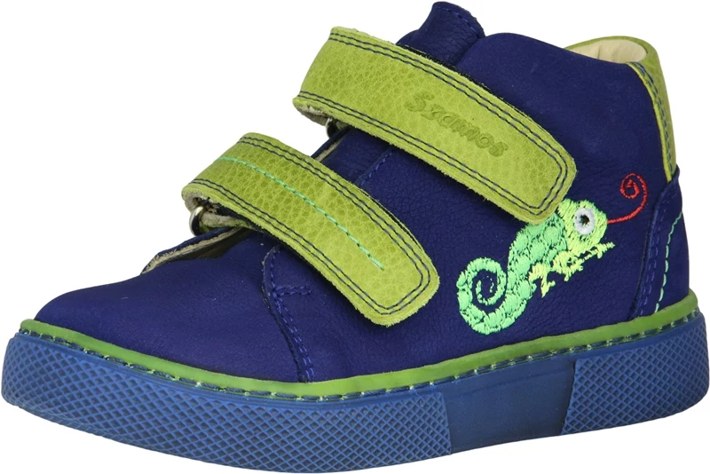 Szamos fiú kék színű két két tépőzáras valódi bőr gyerekcipő hímzett kaméleon mintával