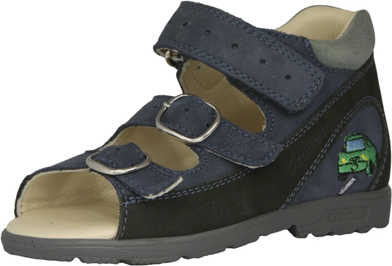 Szamos fiú supinált valódi bőr gyerekszandál hímzett autó mintával kék színben