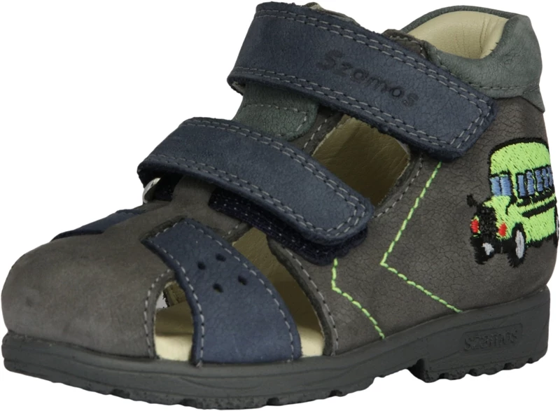 Szamos fiú supinált valódi bőr zártorru gyerekszandál hímzett autobusz mintával szürke-kék színben