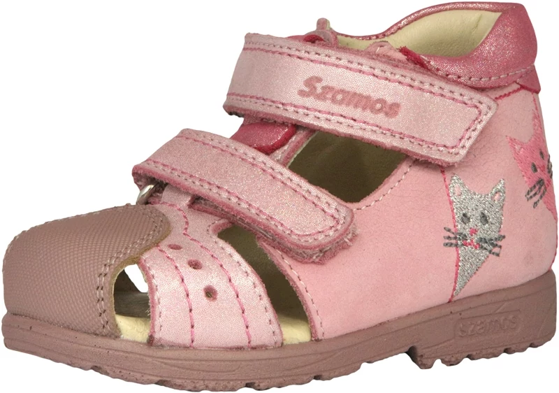 Szamos lány supinált valódi bőr zártorru gyerekszandál cica mintával rózsaszín színben